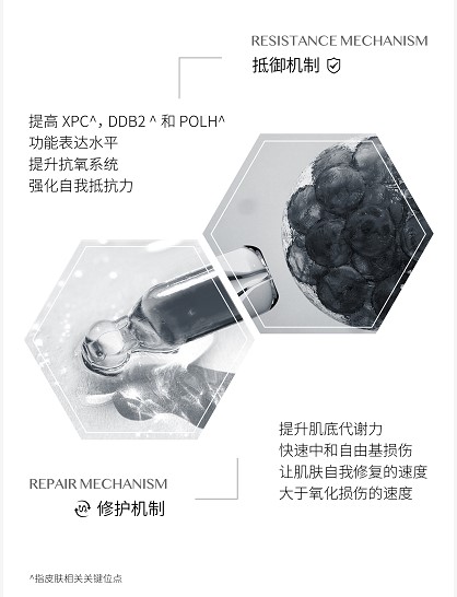 根据巴斯夫个人护理专业实验室及消费者使用体验证实,产品核心成分功效实验数据显示,使用4周即可有效降低胶原降解酶65%,细胞膜被氧化速度降低34%,皮肤DNA修护功能表达速度提高1.6倍,皮肤皱纹减少10%,泛红反应降低42%,皮肤粗糙度降低6%,皮肤代谢力提高17%。长效在线蓄能抗氧能力,强韧肌肤健康体系。
